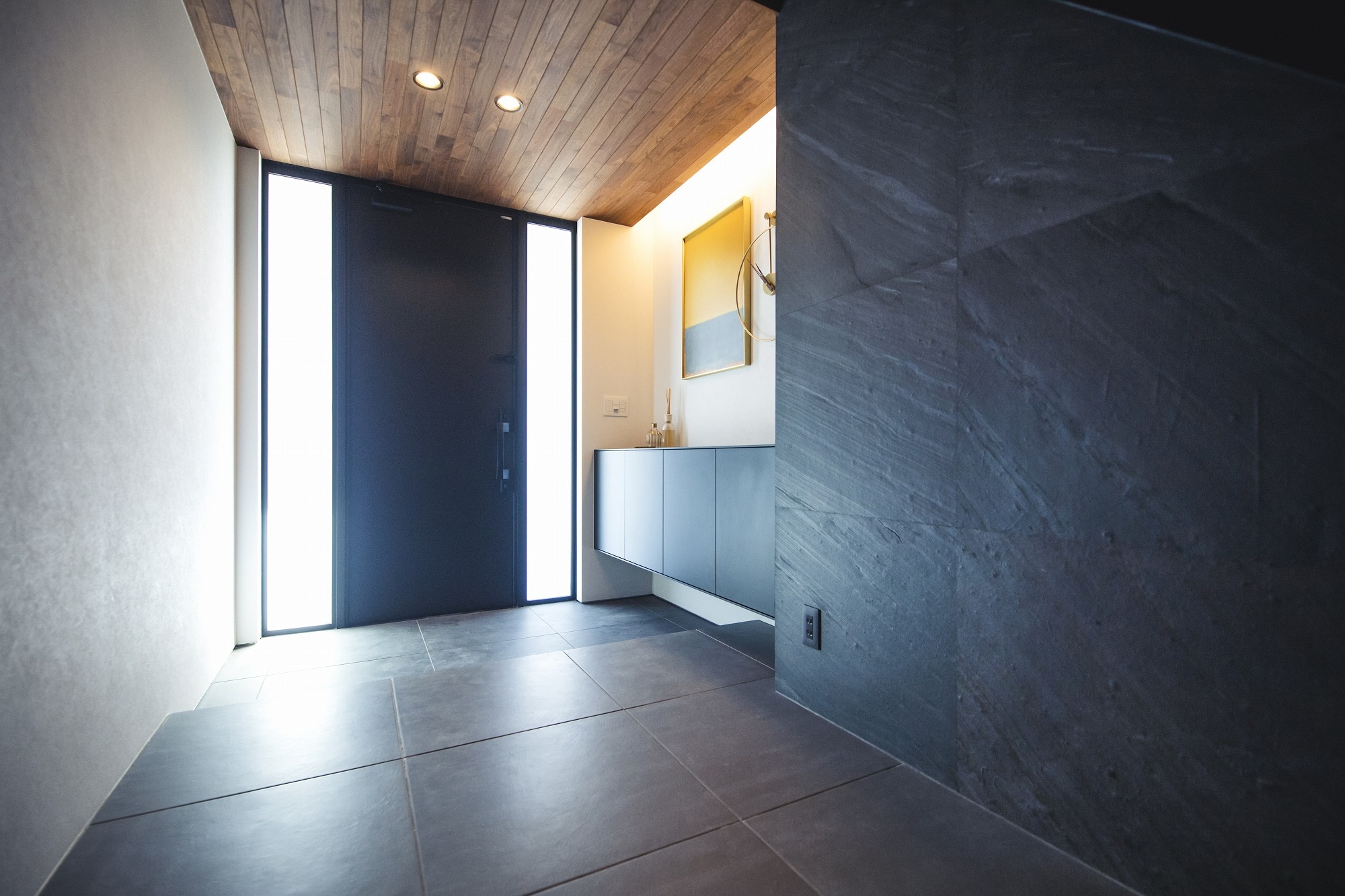 玄関ドアリフォームの施工例1.床と天井の素材をモノトーンなドアで調和