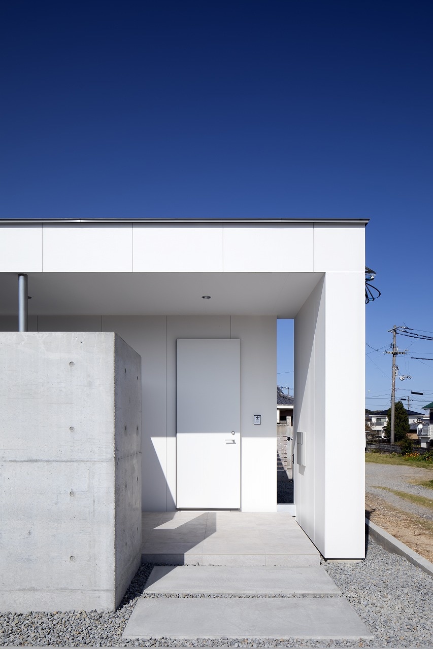 外観のすべてが直線で構成されているデザインです。徹底的に一貫性を持たせるため、玄関ドアもシンプルで潔いホワイトの片開き戸をセレクト。打ちっぱなしのコンクリート塀の存在もスタイリッシュな雰囲気を演出しています。