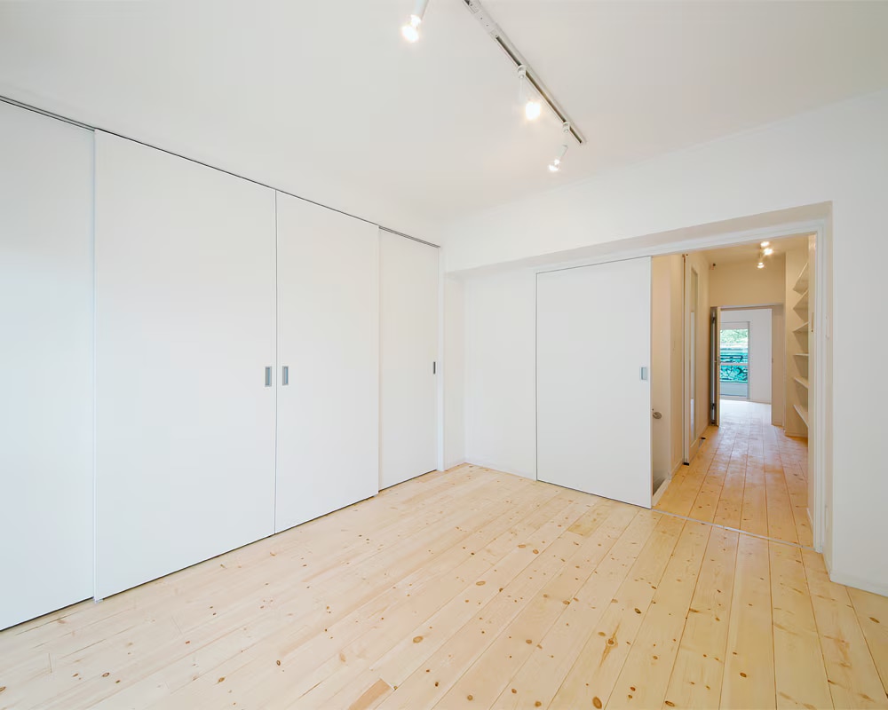 広々とした部屋にナチュラルな木材のフローリングが温かみを加え、白を基調とした壁や天井とのコントラストが清潔感と開放感を演出しています。空間を自由に仕切ることができる大きな引き戸が採用されており、使い勝手の良さと機能性を両立している事例です。