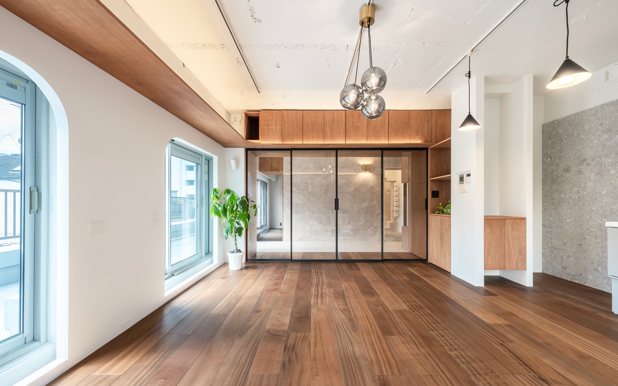 ビンテージマンションのリノベーションにて床材を色合いが美しいサペリに切り替え、開放感のある《クアドロスリム》で仕切った施工事例です。