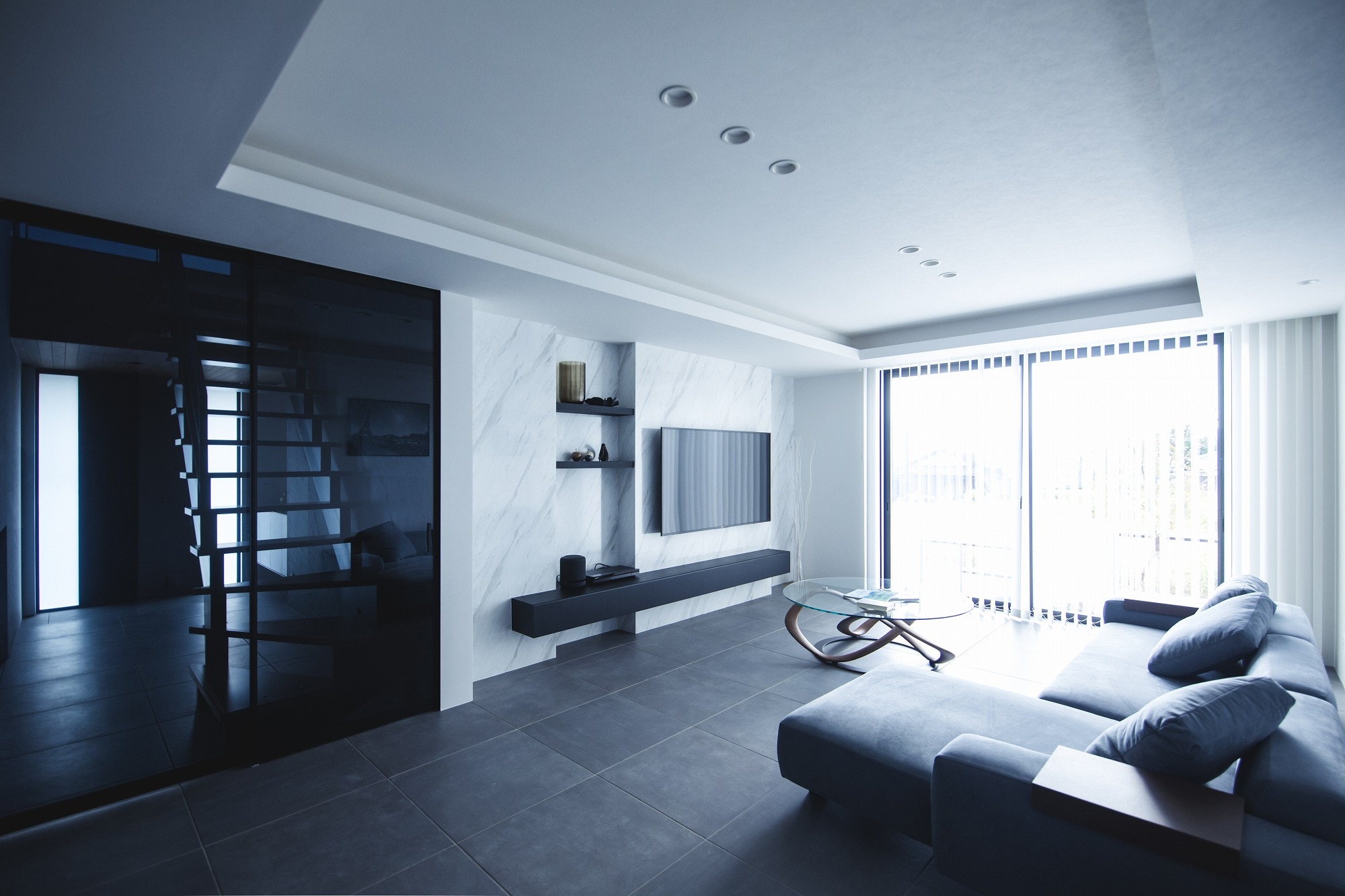 テレビを設置している壁面には、インドの黒御影石をイメージさせる磁器タイル「《ポーラーアルデ》」を採用。深い色合いのカラー「《キャッスルロック》」はコンクリートの壁とはまた違った表情を見せてくれます。