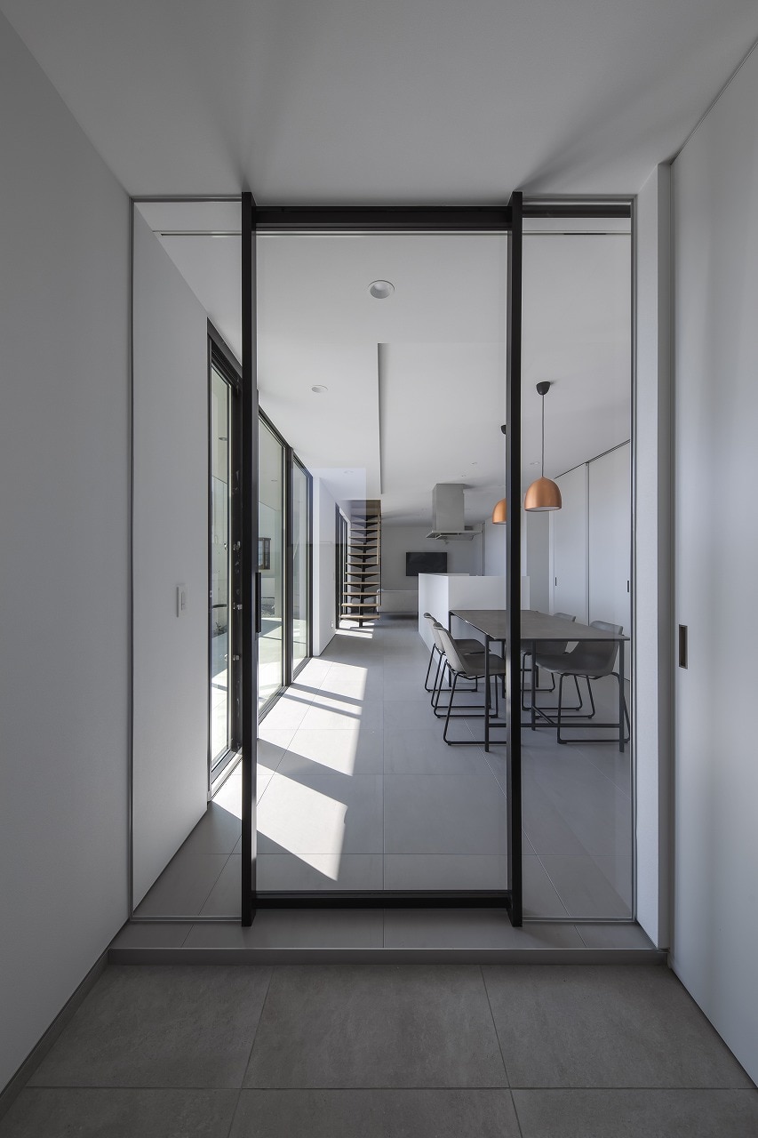 ガラスのドア「《クアドロスリム》」を採用し、スライドドアを通じてリビングが見えるため、開放感と広がりを感じさせる空間を演出している事例です。