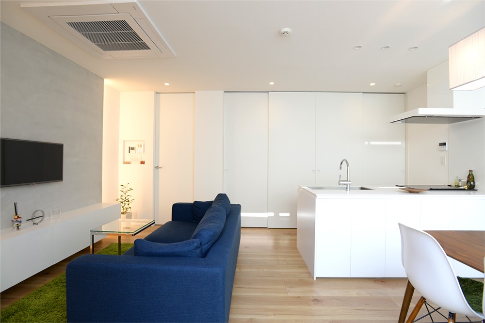 使用しているミラタップ(旧サンワカンパニー)の商品:積層フローリング《エベーロ・プランク スノー》(廃番商品)、システムキッチン《クビレキッチン》、キッチンパネル《アルミナ