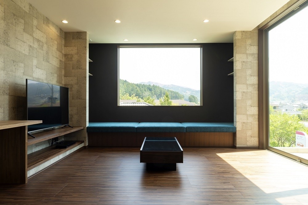 テレビの背後にある壁を彩るのは、山から採取した原石を加工した板石「《バンピーウォール》」。照明は控えめながらも効果的に配置されており、石壁のテクスチャーを際立たせつつもリビング全体に温かく柔らかな光を届けています。