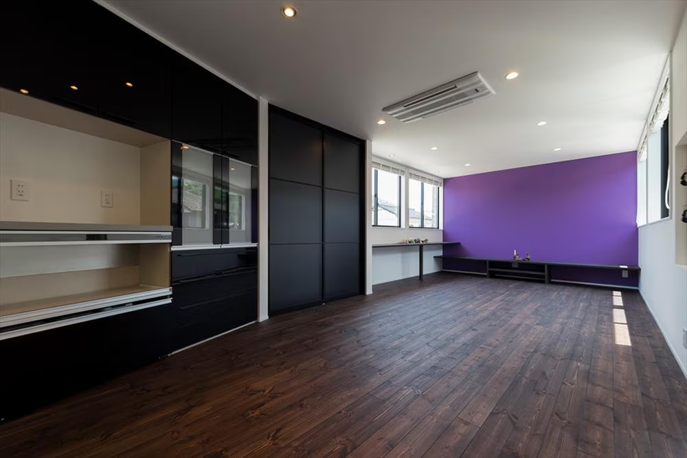 リビングの一角には鮮やかなパープルのアクセントウォールが施されており、空間にエネルギーと個性を付与。この大胆な色使いがシンプルでモノトーンなインテリアに対して視覚的なコントラストを生み出し、モダンでありながらも遊び心を感じさせるデザインとなっています。