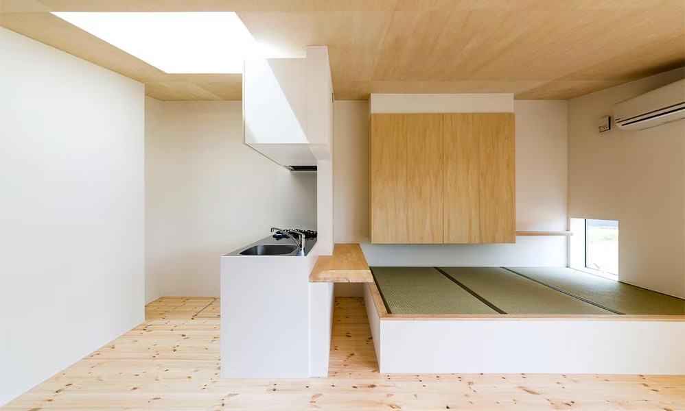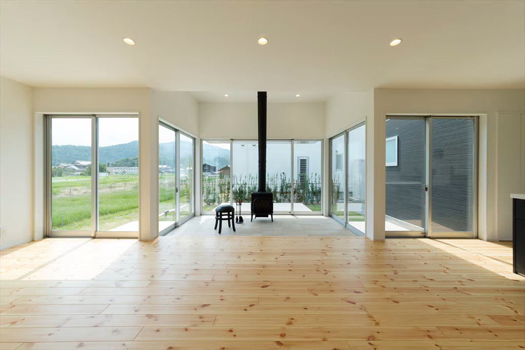 田園や山を眺められる天井まで広がる大きな窓や、畳の横にある小窓により、開放感溢れる仕上がりに。室内の淡い色合いとシンプルな照明が、リビングに柔らかな印象を与え、リラックスできる空間となっています。