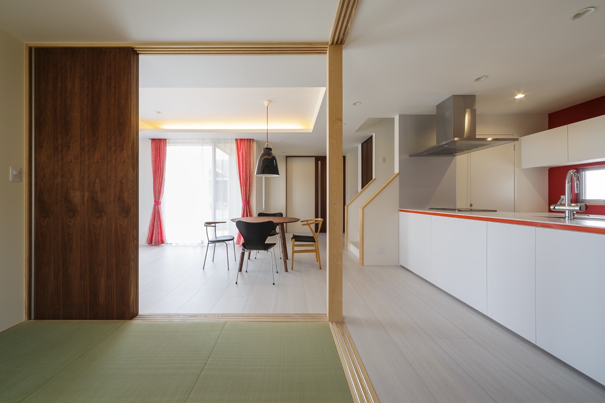 白を中心としたモダンなインテリアと日本伝統の畳を組み合わせた和モダンなリビングです。カーテン・キッチンには差し色としてレッドを使用し、少し華やかな印象を持たせています。