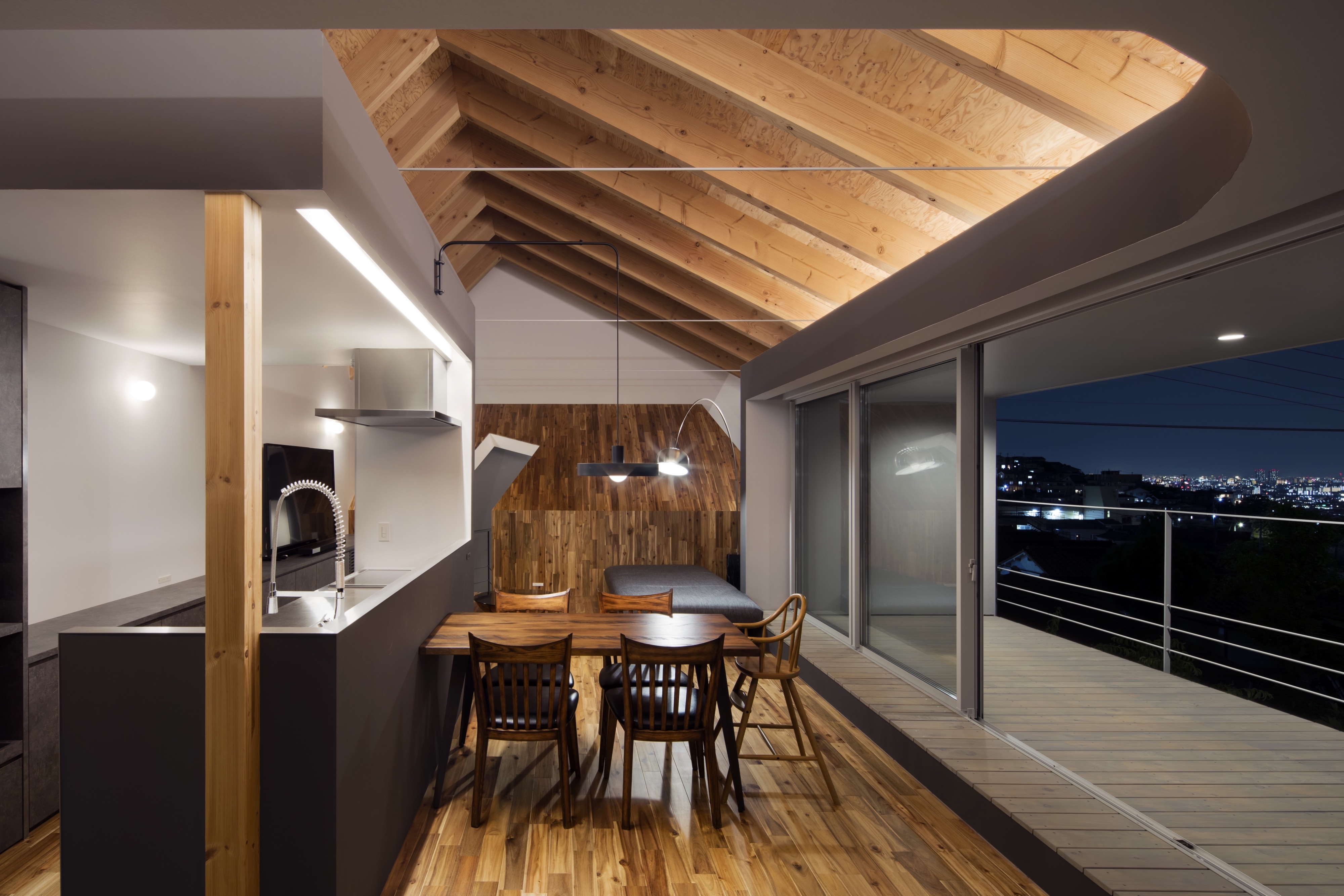大阪の市街地を一望できる高台にあるリビングです。リビング全体に広がる大きな窓や板張りの高い天井により、とても開放的な空間となっています。日が暮れれば、広いベランダで夜景を見ながらリラックスできるでしょう。