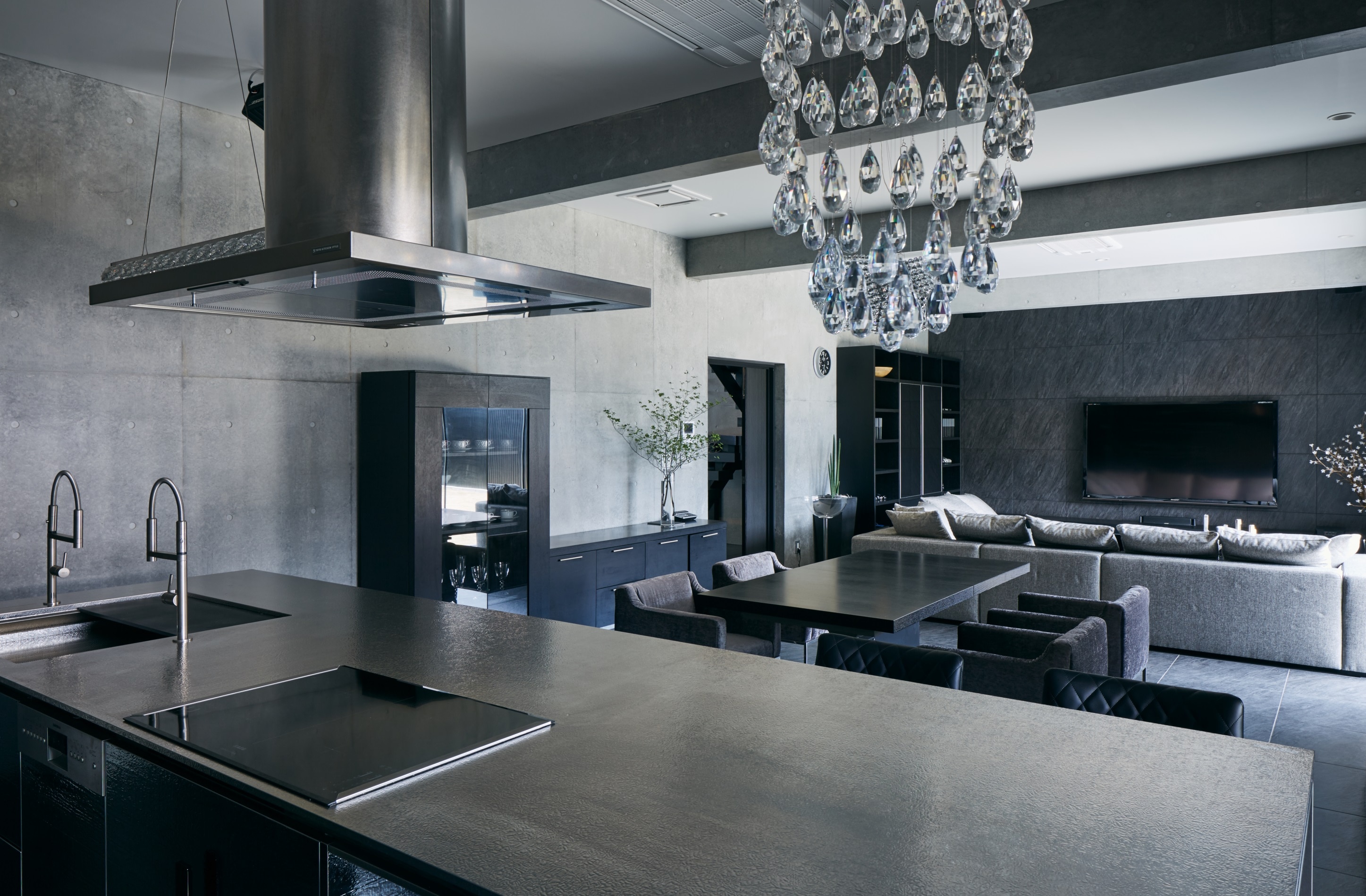 シックな色合いのセメント調タイル「ダスト」を敷き、大人なモノトーン空間を作り上げています。