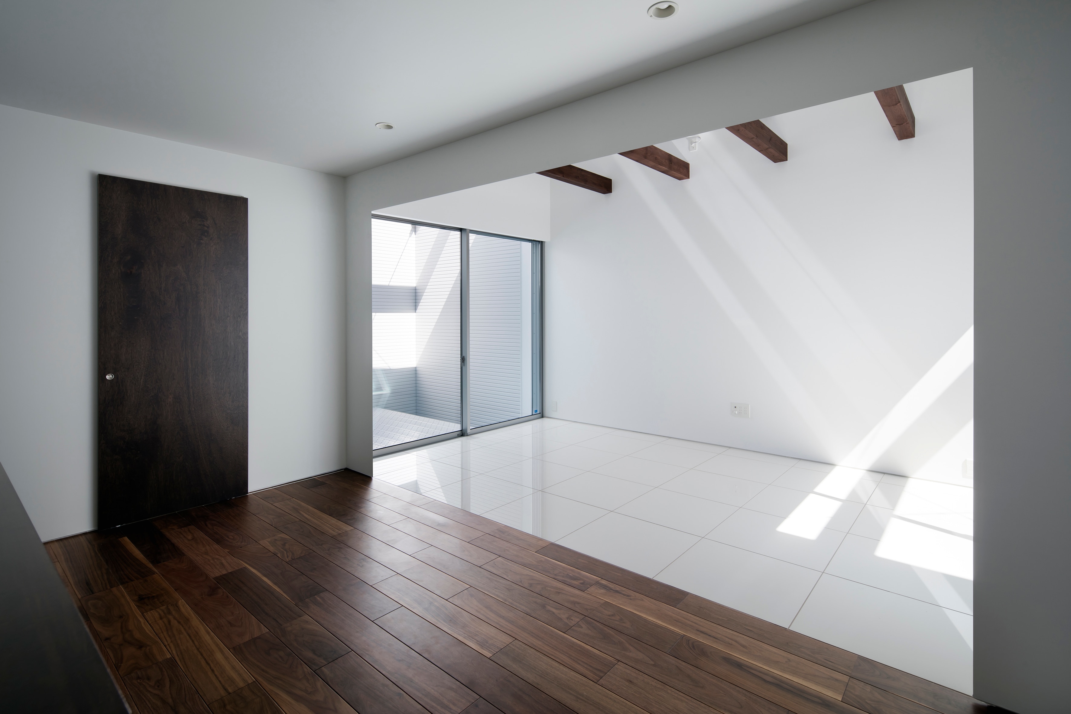ドアのある空間には木目の床材、窓側は白色のタイルを張りひとつの空間で異なる表情を楽しめるリビング・ダイニングです。