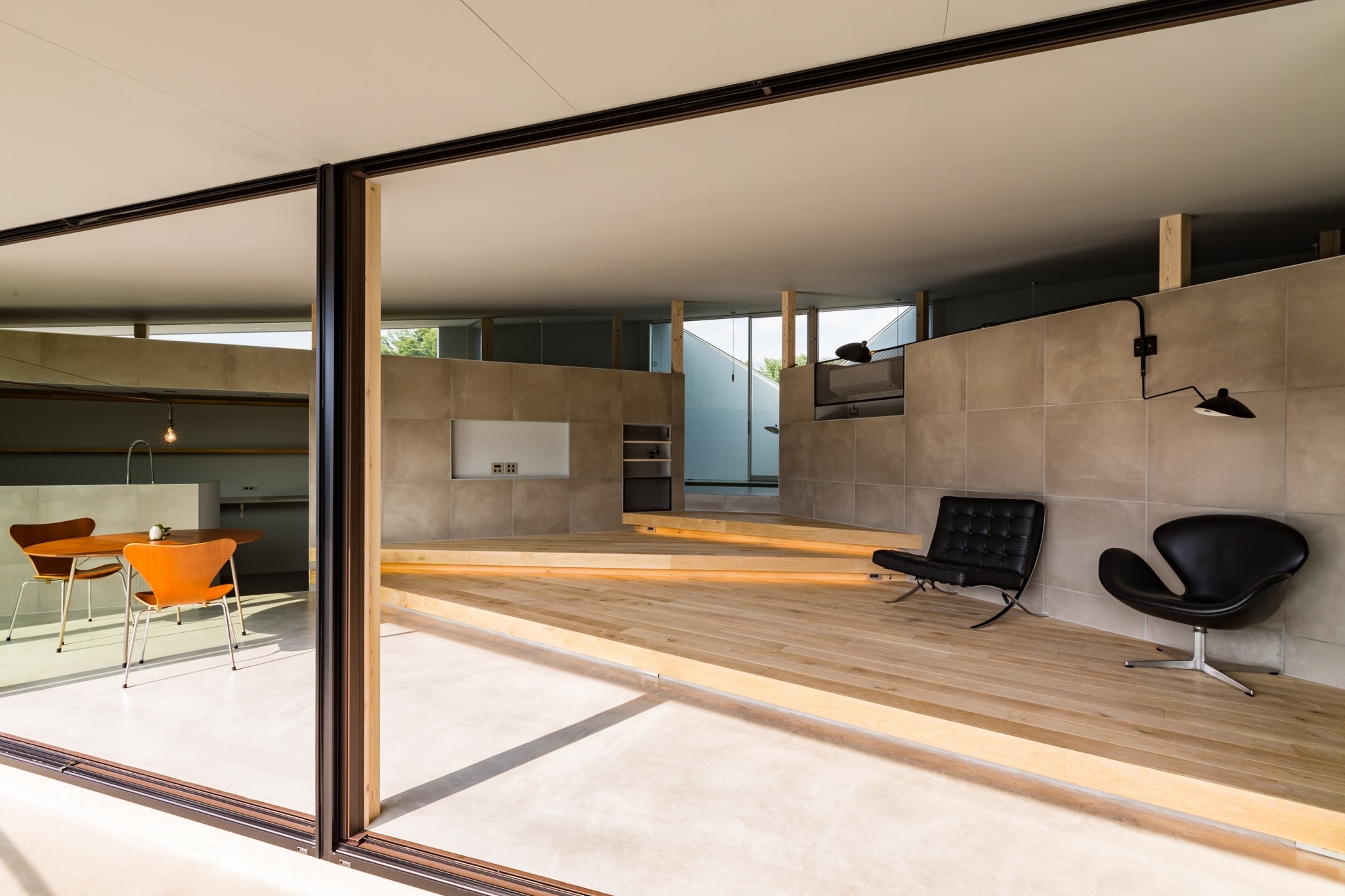 リビング一面に広がる巨大な窓からは、庭に植えられた木々の鑑賞が可能です。多くの光がリビングに差し込み、自然との繋がりが感じられる開放的なスペースとなっています。