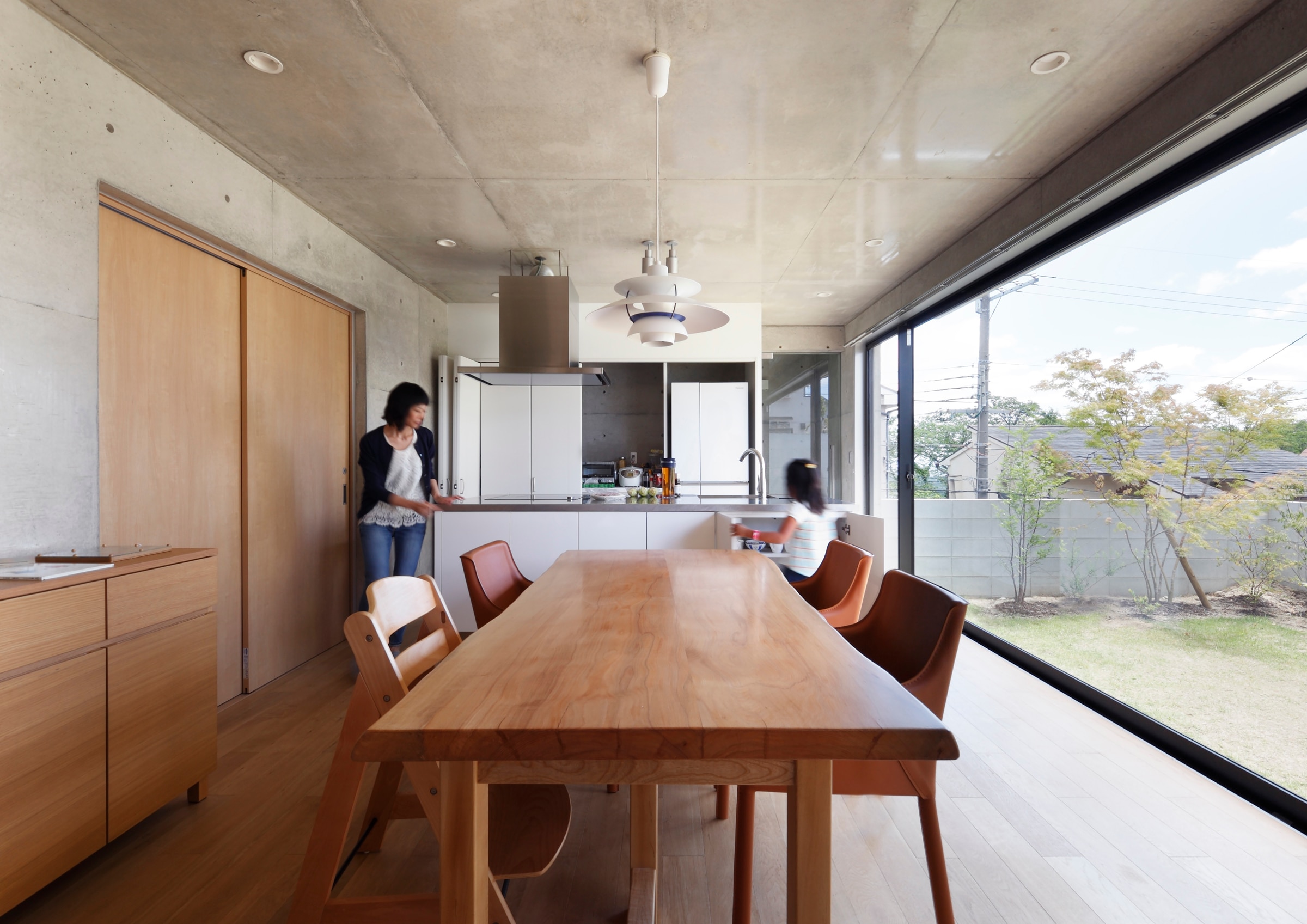 部屋の奥行きを活かして、木製の流し付きダイニングテーブルを備えているリビングです。