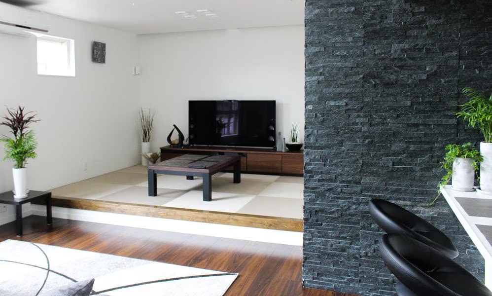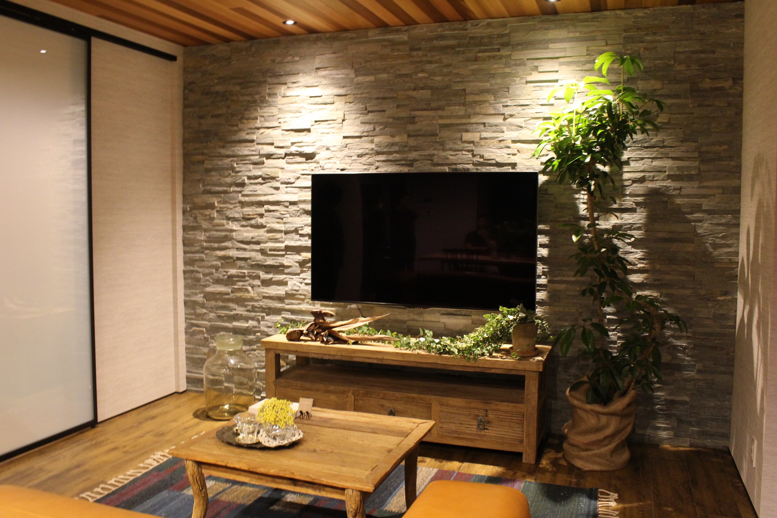石積み風の壁が部屋全体に重厚感と落ち着きをもたらし、木製のテレビ台・テーブルや柔らかな木目のフローリングが相まって自然の魅力に満ちている空間となっています。
