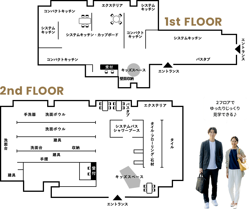 名古屋ショールームは2フロアで構成されており、1階はキッチン、2階は建具やタイル・洗面・フローリングなどを展示しています。