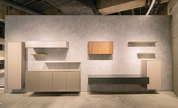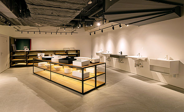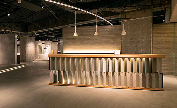 最新アイテムを展示するだけでなく、地元福岡の自然素材である甘木の赤土を用いた土壁、有明海で取れた古代貝灰を用いた漆喰などを仕上げ材として使用することで、地域性と歴史を感じられる空間となっております。