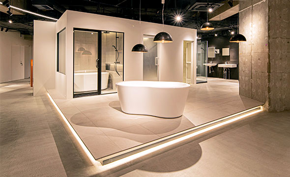 システムバスやシャワーブースなどのバスルーム関連商品も数多く展示しています。