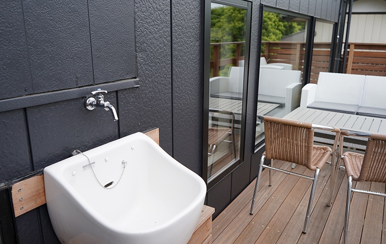 ウッドデッキには洗面器≪スロップシンク≫ を使用。テラスでは備え付けの機器でBBQを楽しむ事も可能