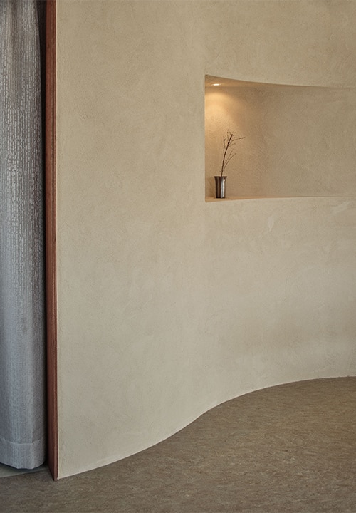 髙橋:例えば、曲面壁はプレーンなビニルクロスではなく、ざらっとした質感の左官壁にしています。夕方の光がちょうど曲面壁に差し込むのですが、より立体感が生まれます。他にも、ラワンの木材やリノリウムの床材を取り入れて、時間帯によって柔らかさが変化するようにしました。