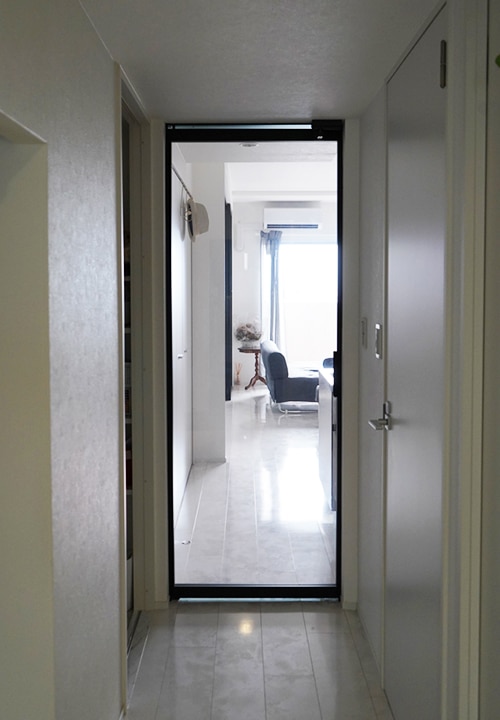 S様:高層階の展望や風通しを活かしつつ、限られたスペースをいかに広く見せるかにこだわりました。玄関は廊下を無くして広くスペースを取り、リビングへのドアを《クアドロスリム》にしました。夜の帰宅時には、玄関を開けるとリビングの先の夜景が見えます。真っ暗な部屋に宝石箱があるようで、とても贅沢な気分になります。