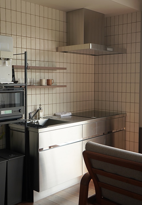 佐藤:はい。景色を最大限に引き立てるため、キッチンや洗面は極力シンプルで装飾の少ないデザインが理想でした。キッチンに採用した《グラッド45》は、無駄のないミニマルなデザインが決め手となりました。本施設では食事プランをご選択いただいた場合は、こちらのキッチンを使って簡単な調理をしていただいたりもします。必要な家電も備えているので、お家で過ごすようにくつろいでいただけます。