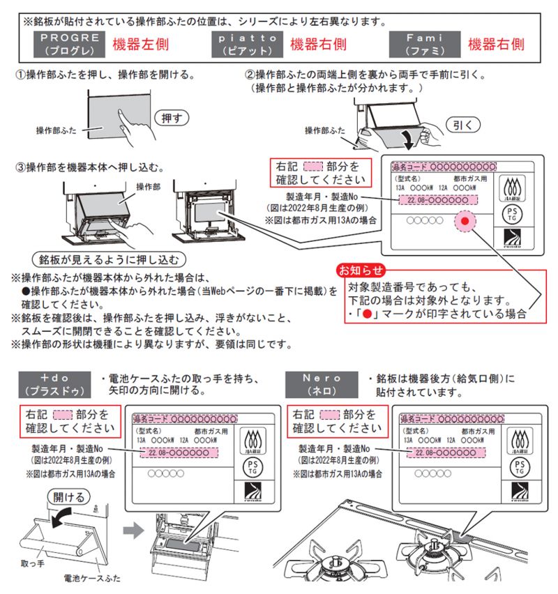 ※下表対象製造番号であっても、銘板に赤丸「●」マークが印字されているお客様については、検査確認済みの正常品ですので、対象外となります。