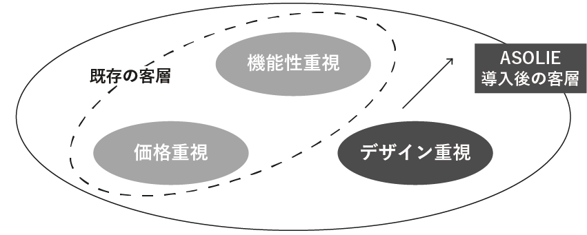 ASOLIEを導入することにより、「デザインにこだわりをもったお客様」「ミニマルでシンプルなデザインが好きなお客様」などデザイン意識の高い新たな客層を獲得することができ、売上の新たなベースを作ることが期待できます。
