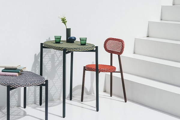一般的なバルコニーのサイズを想定して、テーブルとチェアを両方置いても楽々と座ることができる大きさで設計された《PATIO PETITE WA Series》。ユニークな3色の人工ラタンをハンドクラフトで編み込み、単色では出すことのできない、やわらかなニュアンスを生み出しました。