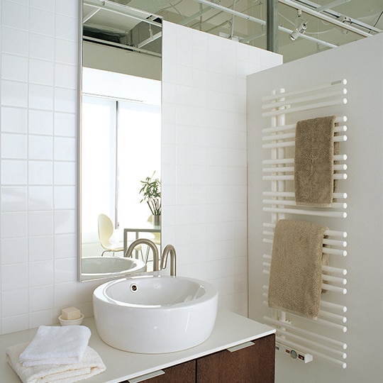 お風呂に入る前にタオルを掛けておくとふわふわのタオルができあがる《タオルウォーマー》。寒い時期のイメージが強いですが、掛けたタオルや室内をからっと乾かす効果があるため、タオル自体のカビの繁殖防止や、バスルームなどでは湿気の多い梅雨や夏にも活躍します。低い温度で連続して運転することが、快適かつ経済的にお使いいただくポイント。掛けるタオルの枚数や、設置場所に合わせてデザインをお選びいただけます。