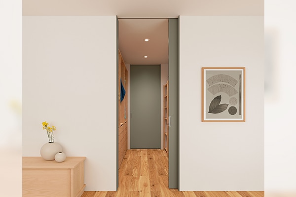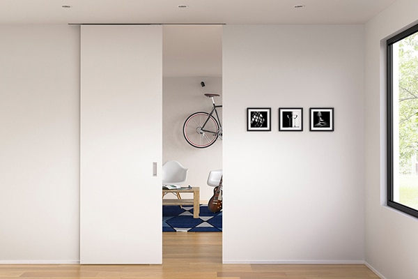 換気の際、開けっ放しにしておいても扉が邪魔にならない引き戸タイプの扉。《ノッポ》は「引き戸」や「アウトセット引き戸」、「壁内引き込み戸」、「間仕切り戸」など、バリエーションやカラーも豊富で、さまざまな空間にご活用いただけます。