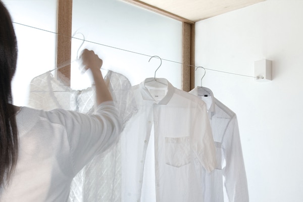 部屋の中で洗濯物を干しているけど、物干し竿やバーはちょっと…という方におすすめの、絵になる物干しワイヤー。壁に設置し、使う時にワイヤーをさっと引き出してロックすれば、洗濯物を干していただけます。使わない時はインテリアに馴染むコンパクトでおしゃれなデザインです。