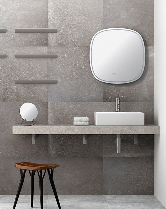デザイン性だけでなく機能性にも優れた《LEDミラーNEO》。照明・曇り止めヒーターのスイッチにタッチセンサーを採用し、薄くスッキリとしたデザインに仕上げました。エッジのライトが間接照明のように周囲をやさしく照らし、上質な空間を演出します。