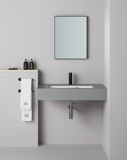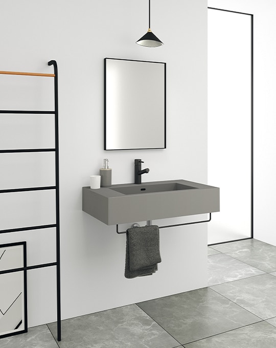 グレーの洗面ボウルは白と黒をつなぐ中間色としてコントラストをやわらげ、空間にニュートラルな表情を生み出します。海外インテリアのように洗練された雰囲気を出しながらも、足元が空いているので圧迫感がなく、洗面空間をすっきり見せられるコーディネートです。