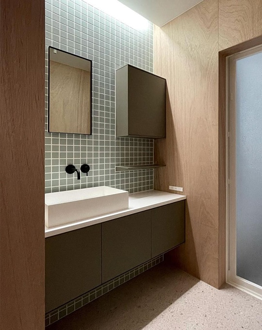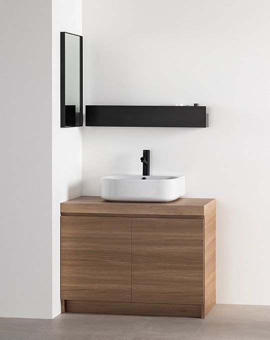 1mm単位でサイズオーダーできる《ピッタラ》、《ピッタナ》を使ったコーディネート。ミラーの高さや洗面スペースの幅に合わせてオーダーし、イメージ通りの収まりに。洗面ボウル《アッセ》のピンとした薄いエッジラインも、スタイリッシュな空間演出の一翼を担っています。