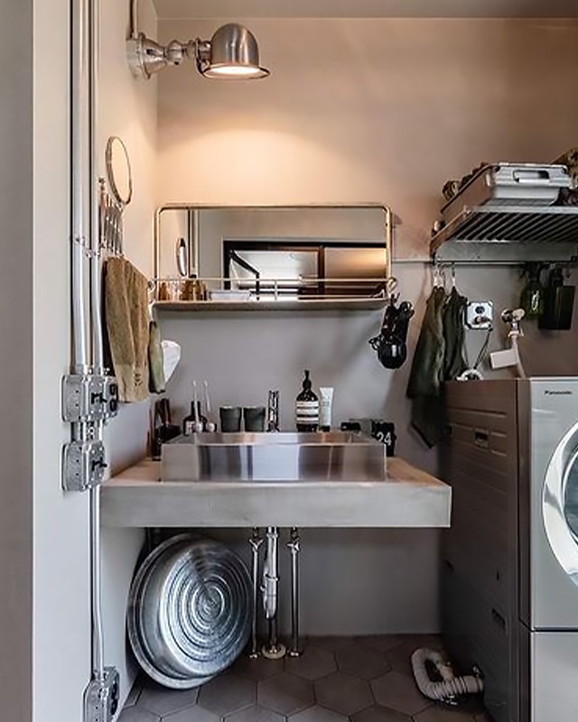 まるで造作洗面台のようなグレーインテリアにマッチする洗面空間