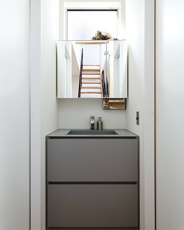デザイナーや建築家から要望の多かった深型シンクとシャワー水栓を採用しており、その使いやすさから人数の多いご家庭にも好評の洗面台。深型ボウルと天板は一体形成なので隙間がなく、お掃除ラクラク。生活感は隠しつつ、日々の使い心地も妥協したくない方へおすすめのコーディネートです。