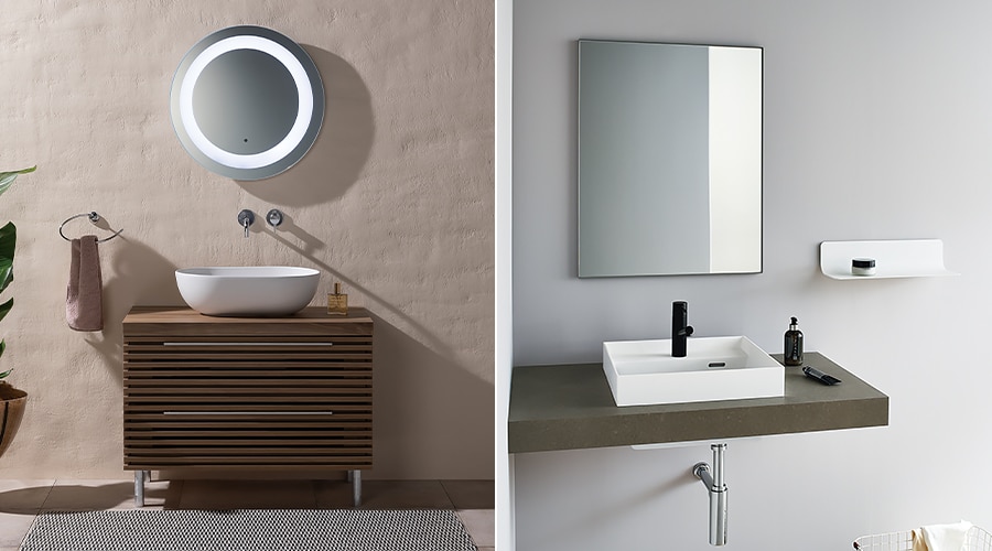 洗面台は、ミラー・水栓・洗面ボウル・洗面下台の組み合わせでできています。ミラタップ(旧サンワカンパニー)では、全てがセットになったタイプから、お好みのパーツを組み合わせるタイプまで幅広くご用意しております。