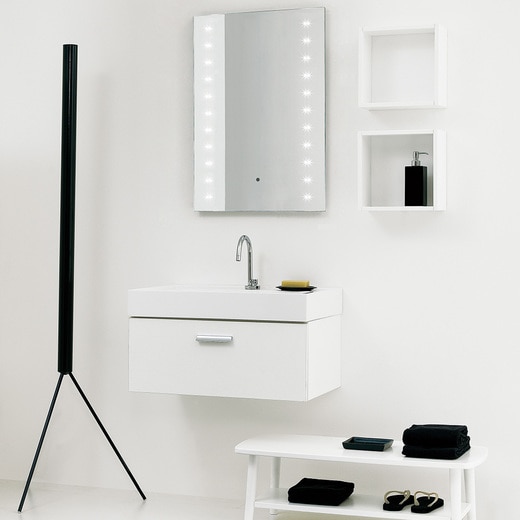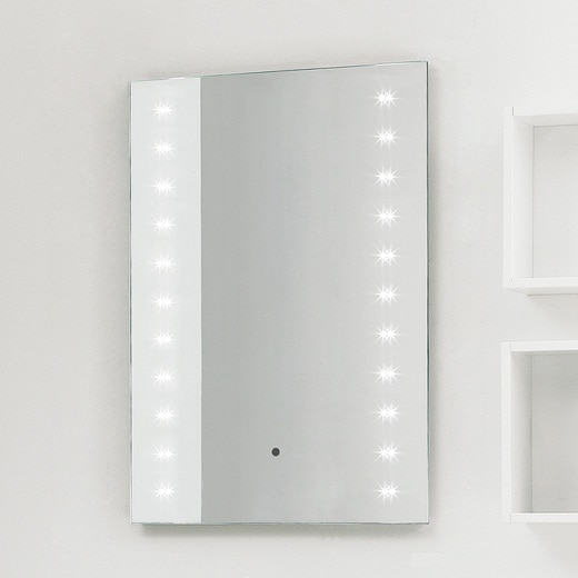 LED照明が付いたミラーです。照明スイッチに高感度センサーを採用し、鏡面に接触せずON/OFF切替可能になりました。デザインは星や星座に由来し、LEDの輝きを星のまたたきになぞらえているよう。クリアな瞬くような照明、LEDでしかできなかったことを実現しました。