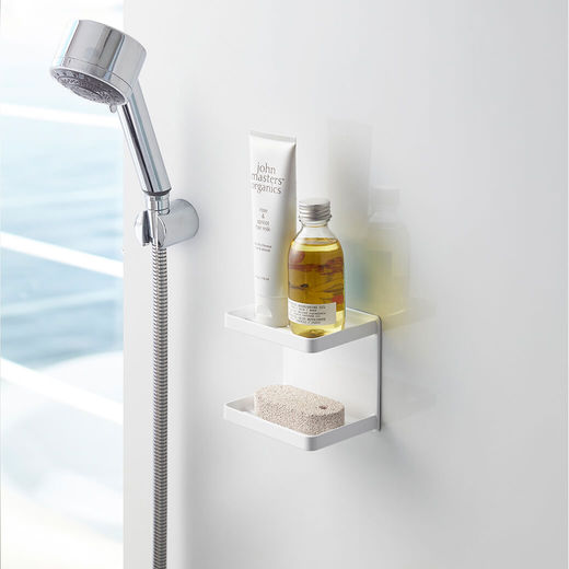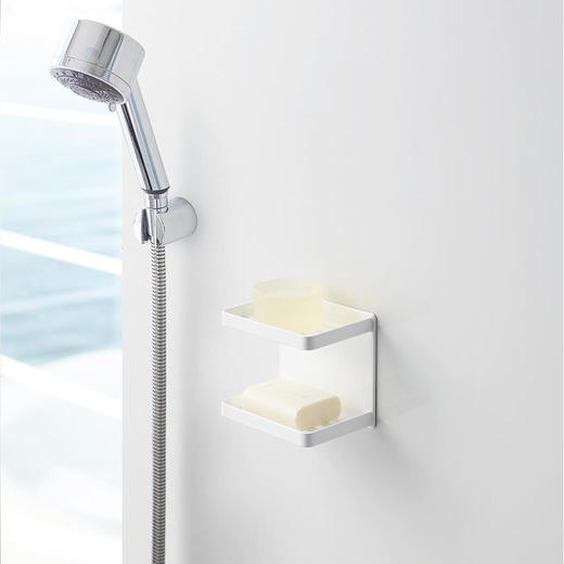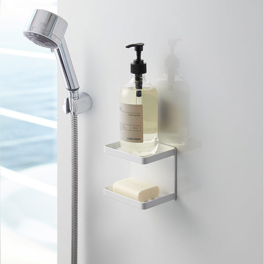 マグネットが付く浴室壁面に簡単に取り付けられるソープトレー。1つ分のスペースで2個置ける省スペースタイプ。ディスペンサー・タンブラー・洗顔チューブも置けます。