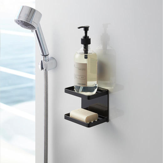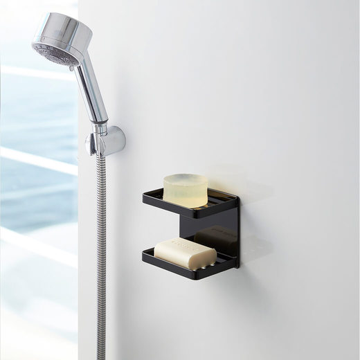 マグネットが付く浴室壁面に簡単に取り付けられるソープトレー。1つ分のスペースで2個置ける省スペースタイプ。ディスペンサー・タンブラー・洗顔チューブも置けます。