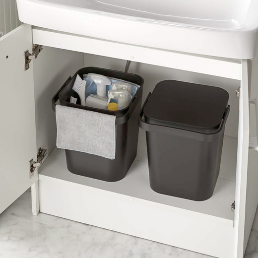 フタが付いたスタイリッシュなデザインのバケツ。バケツとしてはもちろん、オモチャや掃除用品の収納などにも使えます。シンプルなデザインなのでリビングやサニタリールームなど置く場所を選びません。