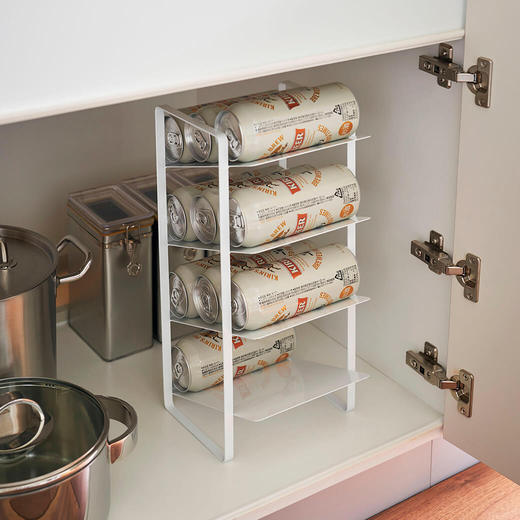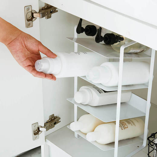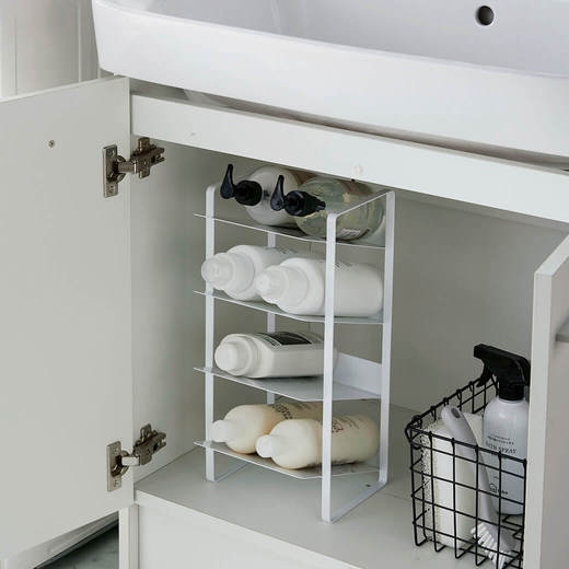 洗面下やキッチン下の収納として使用できる便利で取り出しやすいボトルストッカー。調味料ボトルやペットボトル、シャンプーボトル、洗剤ボトル、スプレー缶まで幅広く収納可能な4段ストッカーです。