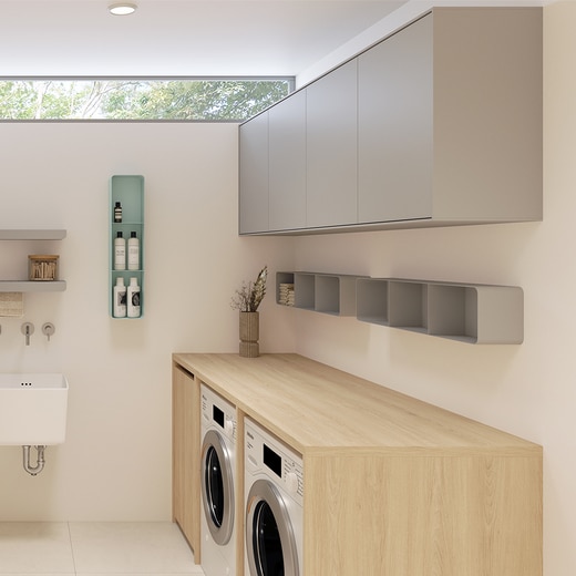 柔らかな曲線と豊かな色合いが特徴のランドリー収納シリーズ≪ラモニー≫は、洗濯作業を効率化するためのランドリールームに最適な商品です。スロップシンクの上に設置することで、洗い物を一時的に置くスペースとして活用できるほか、日常的に使用する洗濯用品を「見せる収納」として美しく整理できる多彩なラインナップをご用意しています。収納からフックまで、同シリーズでトータルコーディネートをお楽しみいただけます。