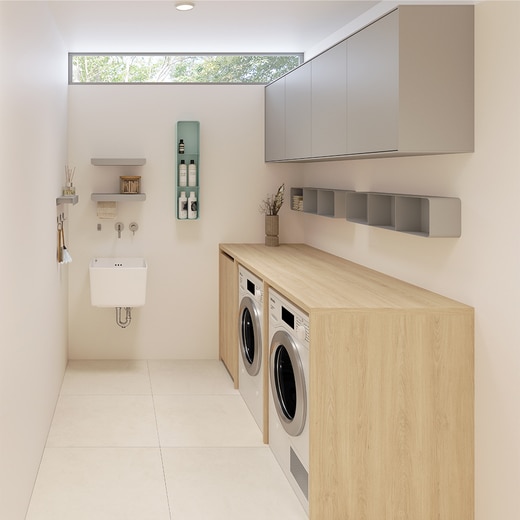 柔らかな曲線と豊かな色合いが特徴のランドリー収納シリーズ≪ラモニー≫は、洗濯作業を効率化するためのランドリールームに最適な商品です。スロップシンクの上に設置することで、洗い物を一時的に置くスペースとして活用できるほか、日常的に使用する洗濯用品を「見せる収納」として美しく整理できる多彩なラインナップをご用意しています。収納からフックまで、同シリーズでトータルコーディネートをお楽しみいただけます。