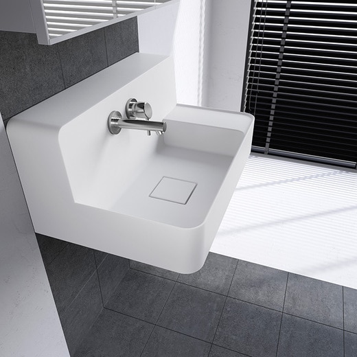 「ボルデ」はイタリア語で「縁」の意味。洗面台を形作る<面と線><直線と曲線>の対比や美しさを追求しました。真っ白な人工大理石と同素材の目皿カバーなど細部までこだわり、無駄を排除した機能美に優れた製品です。