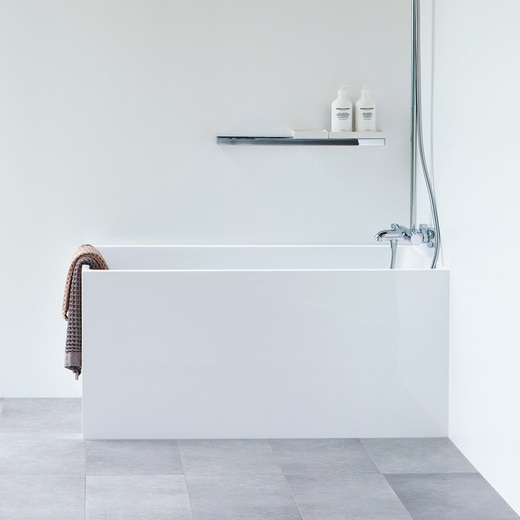 狭小住宅や賃貸マンションにおすすめの、小さいけれど肩までつかれるバスタブです。縁は25mmと薄くし、外寸を変えずに容量を確保。また、転倒事故の安全対策として、洗い場に面した浴槽の縁を50mmに設定しました。