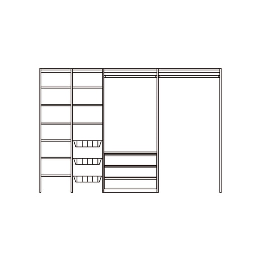 - 固定棚(W436mm):2枚、可動棚436:7枚、引出し収納:1セット、アミカゴ:3セット、ハンガーパイプ(L764mm):1本、ハンガーパイプ(L884mm):1本、転倒防止金具、取付部品