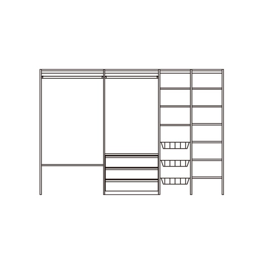 - 固定棚(W891mm):1枚、固定棚(W436mm):1枚、可動棚436:8枚、引出し収納:1セット、アミカゴ:3セット、ハンガーパイプ(L884mm):1本、ハンガーパイプ(L764mm):1本、転倒防止金具、取付部品