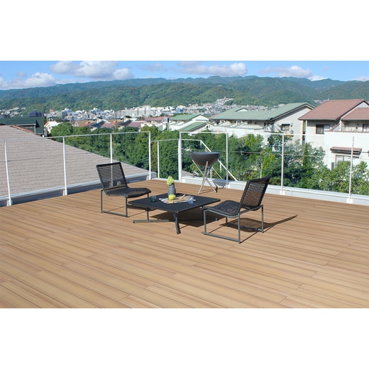 原材料にポリスチレン系プラスチックを使用し、デッキ自体も熱くなりにくく、歩いた時にも熱く感じにくいデッキ材です。従来の脳天ビス止めによる施工も出来ますが、ビス頭が出ないQCSによる施工も可能です。