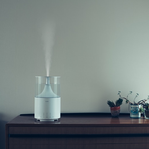 床だけでなく棚やテーブルにも置くことができるコンパクトデザインながら、cado史上最大の約3.5Lの大容量タンクで給水や手入れのしやすさにもこだわった使い勝手の良い加湿器です。LED 照明としての機能も搭載しているため、書斎やベッドサイドなどで間接照明やデスクライトとしてもお使いいただけます。