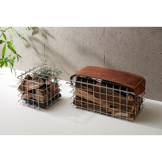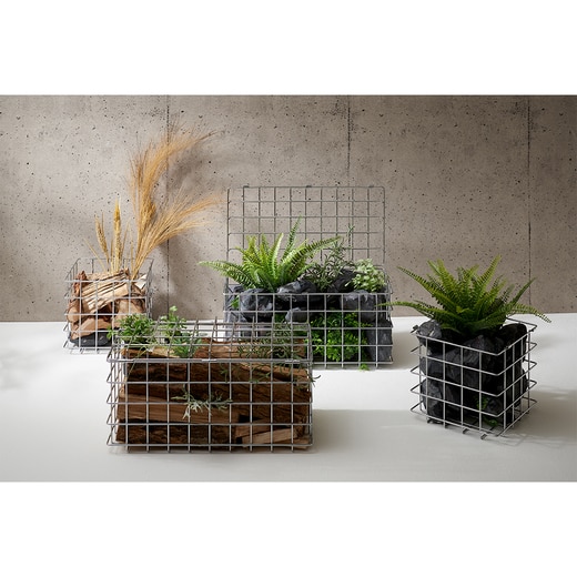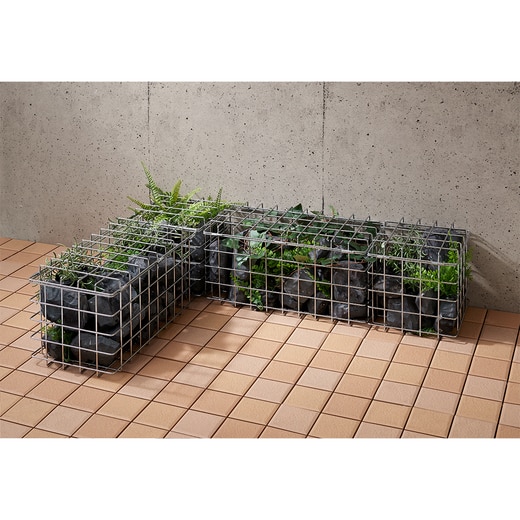 《ミニガビオン》は自然のマテリアルを活用できるプロダクト。景観になじむ、美しく個性的な外観デザインが可能です。ガーデンファニチャー、プランター、インテリアなど、アイデア次第でいろいろなコーディネート展開が可能です。
